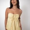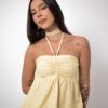 A Bata Rafa Amarela é puro charme e versatilidade! Confeccionada em tecido leve e confortável, ela traz decote reto com franzido no busto e tiras ajustáveis que permitem três formas de amarração: tomara que caia, amarrado no pescoço ou estilo choker. Uma peça, várias possibilidades para você variar no look com praticidade e estilo.