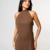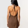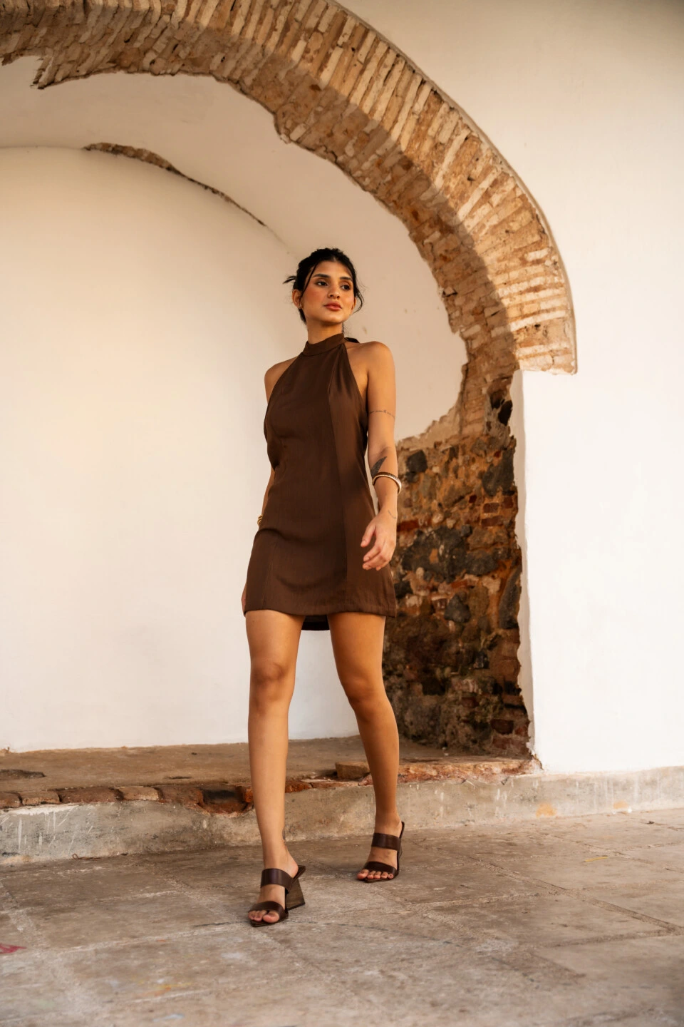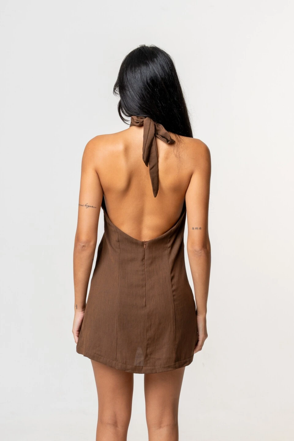 Seu design se destaca pelo decote halter, que alonga a região do colo e traz um toque sofisticado, além das costas abertas com amarração, que adicionam charme e feminilidade à peça. O comprimento curto equilibra o visual com modernidade, tornando-o perfeito para dias quentes ou ocasiões especiais.
