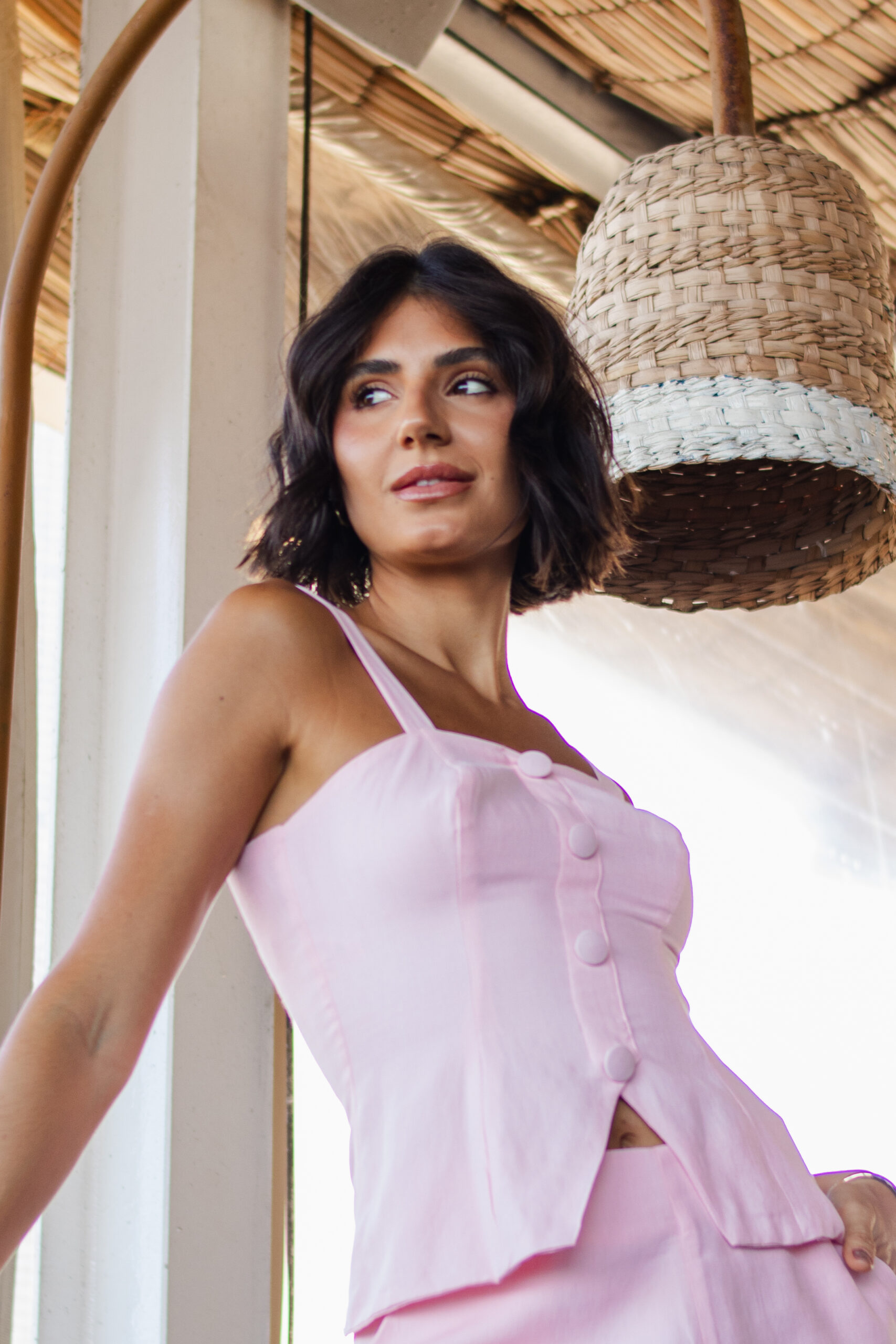 Delicado e versátil, Blusa Marla Rosa bebê é a escolha ideal para looks elegantes com um toque de frescor. Com alças largas e decote reto, valoriza o colo de forma sutil, enquanto os botões frontais forrados acrescentam um charme clássico ao visual.