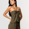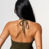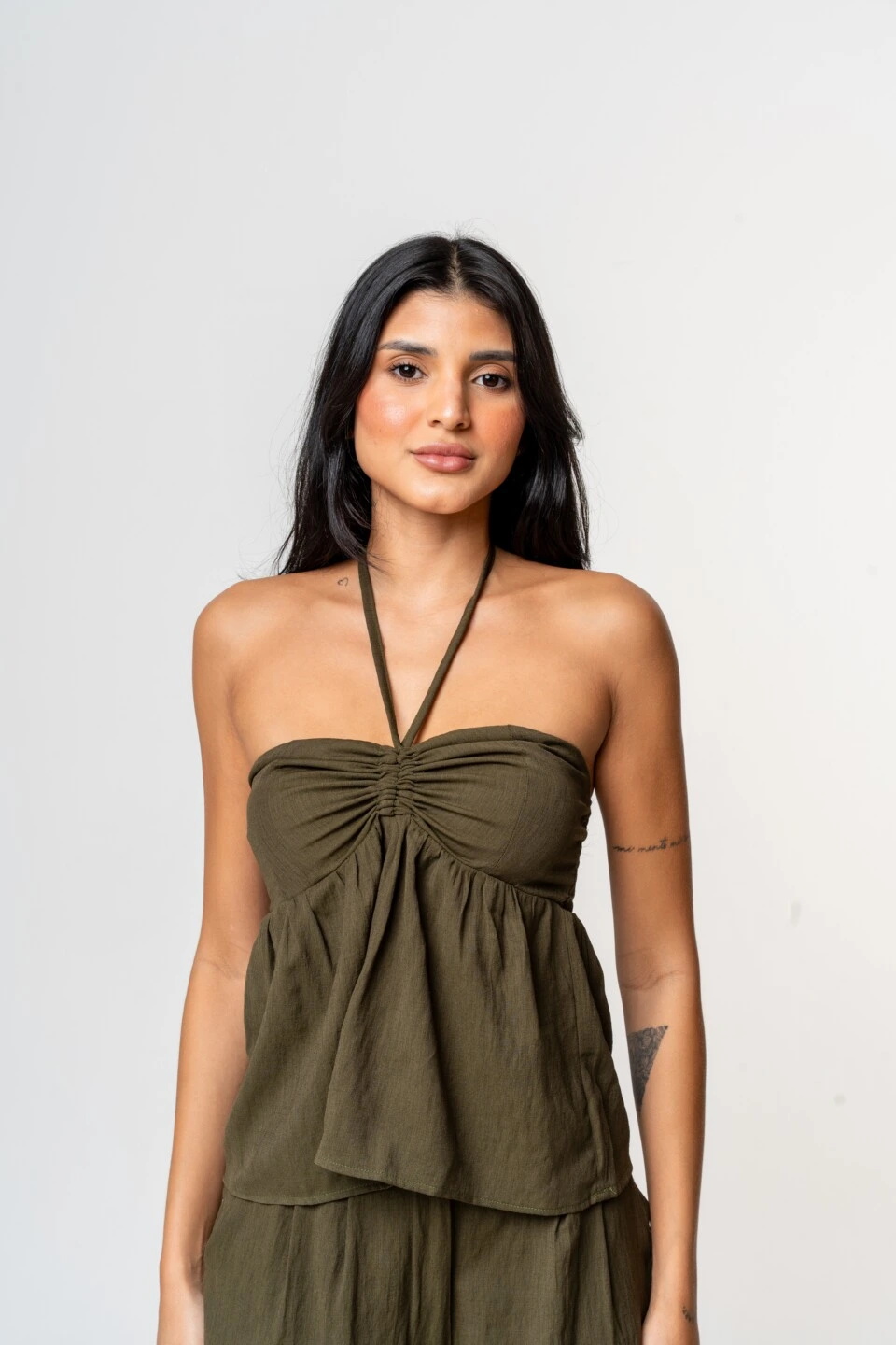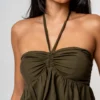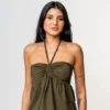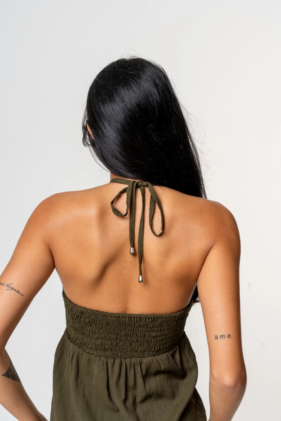 O destaque fica por conta do busto franzido, que valoriza o colo com delicadeza, além da amarração no pescoço, que traz um toque moderno ao design. O acabamento com lastex nas costas garante melhor ajuste ao corpo, mantendo a leveza e liberdade de movimento da peça.
