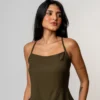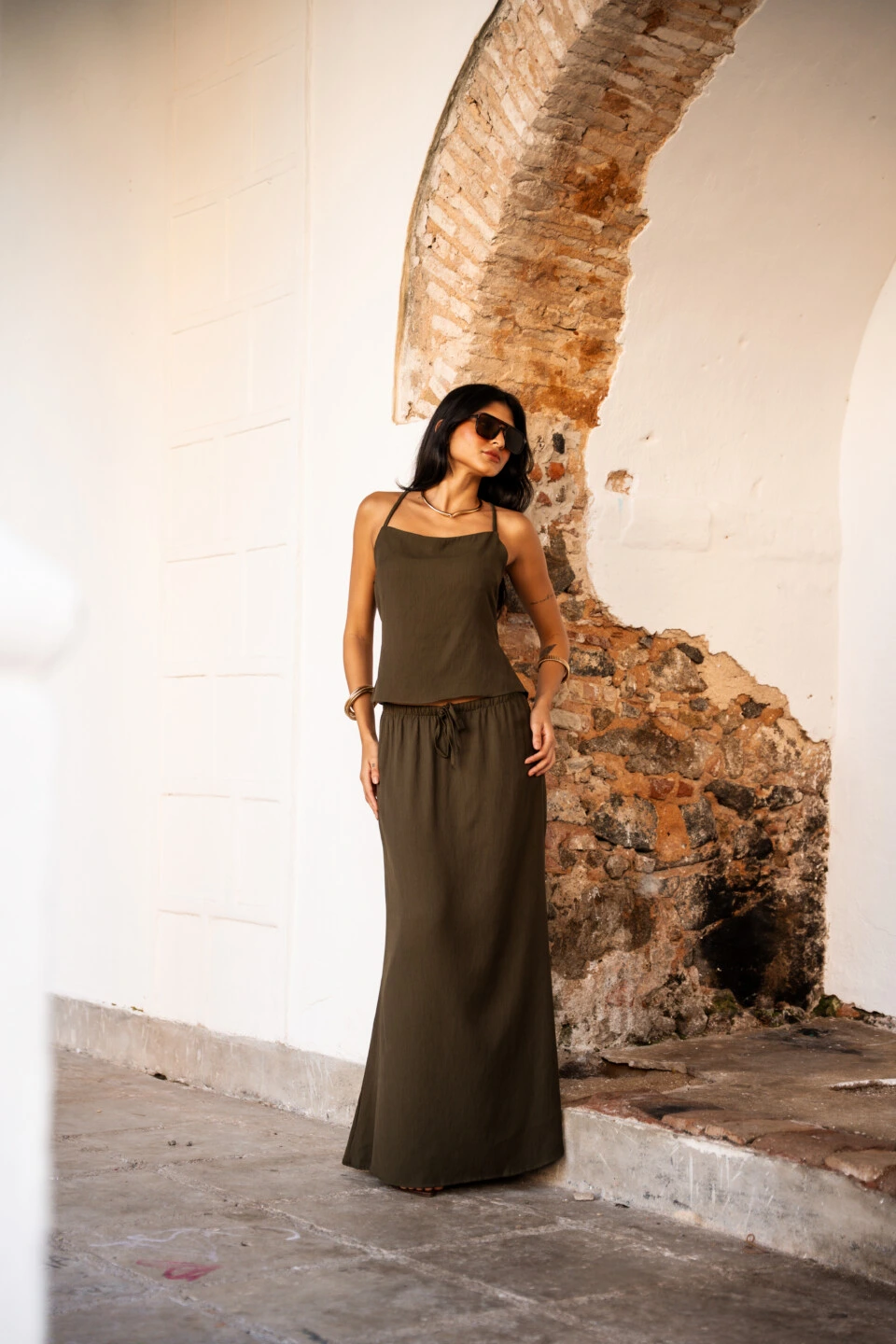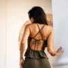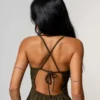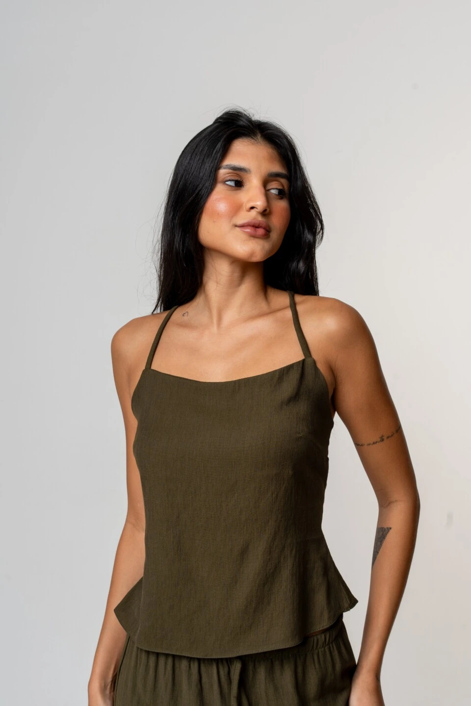 Confeccionada em tecido de textura leve, ela possui modelagem ajustada ao corpo na parte superior e uma barra que traz movimento com ar despojado. O grande destaque fica por conta das costas nuas com tiras cruzadas e amarração em laço, que adicionam um detalhe irresistível e feminino ao visual.