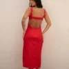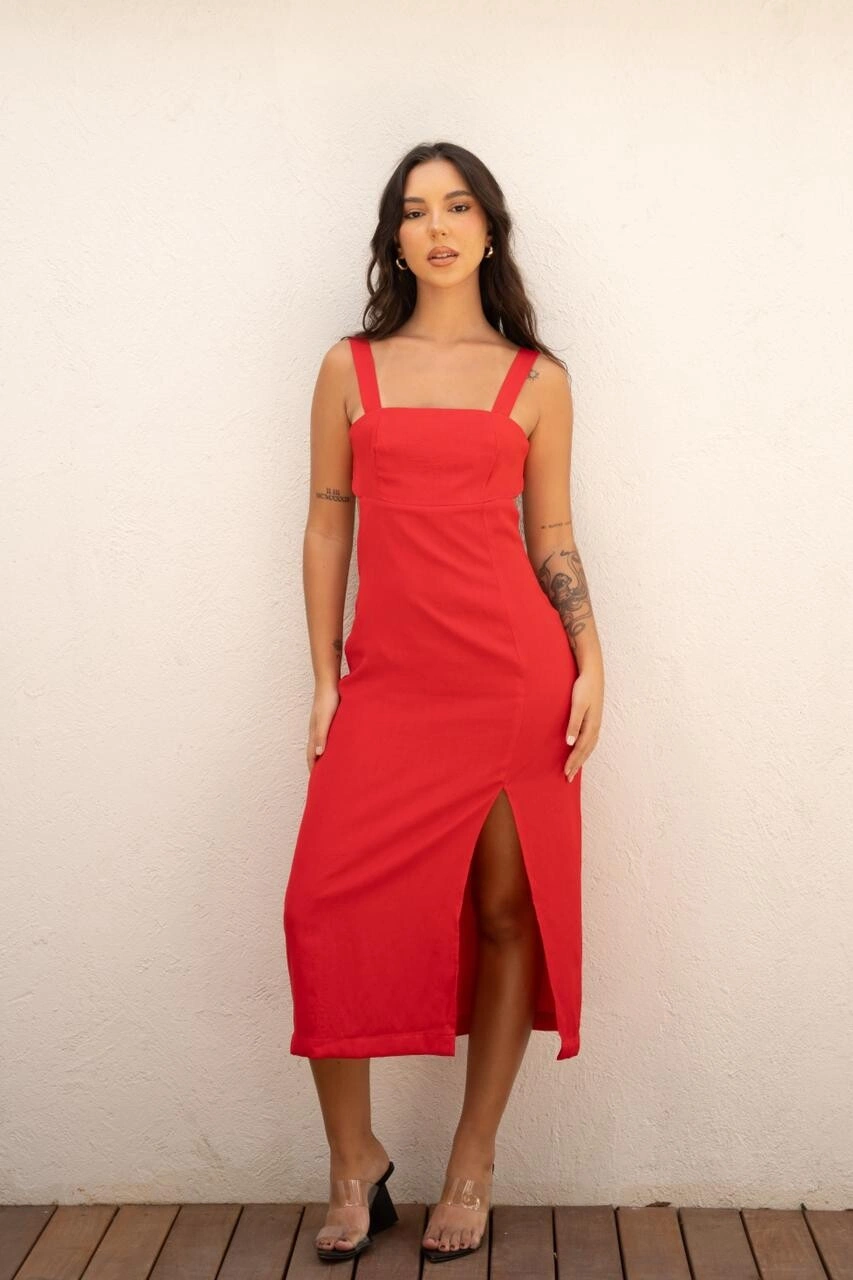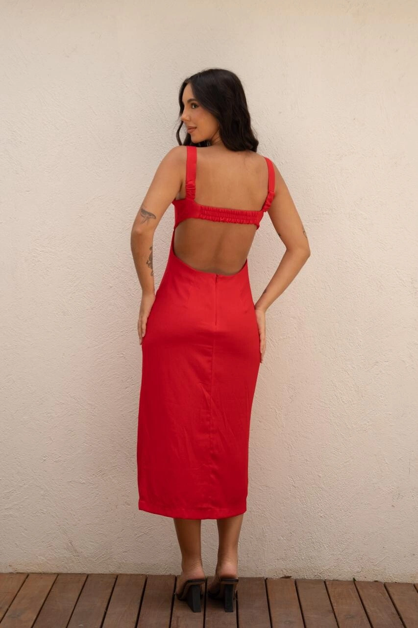 O Vestido Paula vermelho combina feminilidade e estilo com um toque moderno. Possui modelagem ajustada, fenda lateral e recorte nas costas, que destacam a silhueta com leveza. As alças largas trazem charme ao visual.