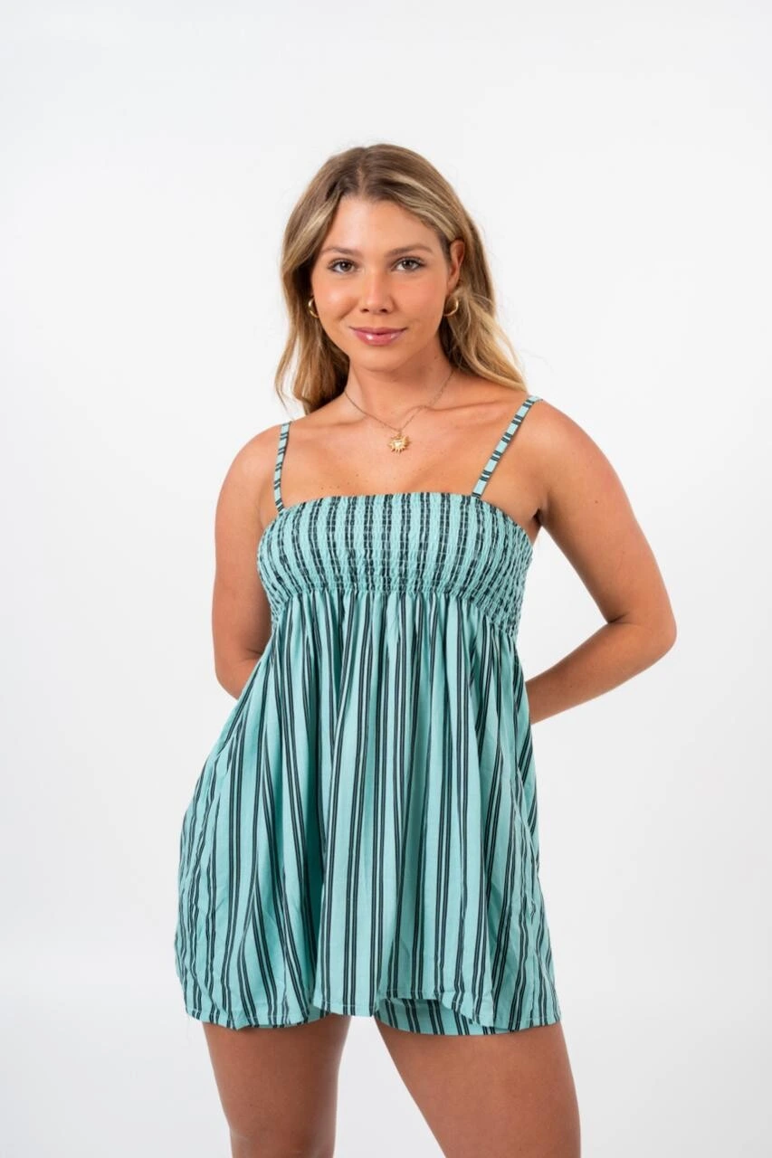 Seu design conta com lastex no busto, que proporciona melhor ajuste ao corpo, além de alças finas que garantem delicadeza e praticidade. A estampa listrada traz um toque contemporâneo e versátil, fácil de combinar com diferentes peças.