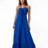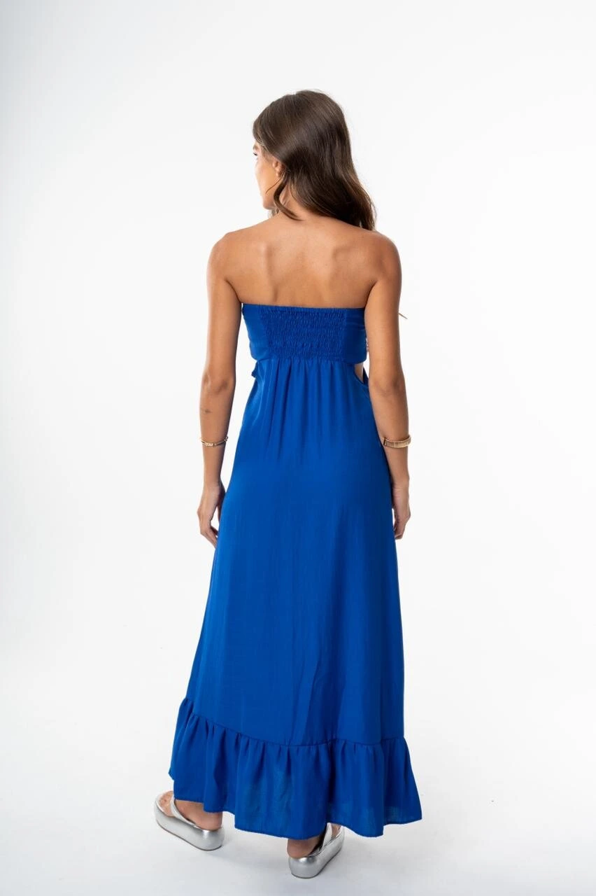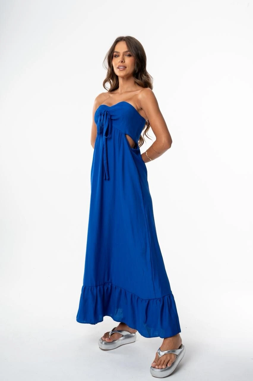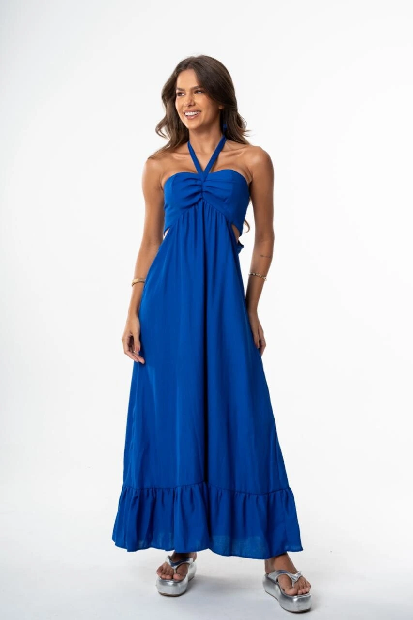 O recorte abaixo do busto acrescenta estilo e destaca a silhueta, enquanto a saia longa soltinha com babado na barra garante movimento e frescor. Sua modelagem fluida proporciona conforto o dia todo, ideal para compor produções despojadas, sofisticadas e cheias de autenticidade.