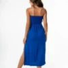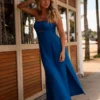 A modelagem justa no busto com saia fluida e fendas laterais garante conforto e movimento, enquanto o zíper invisível na lateral traz praticidade ao vestir.