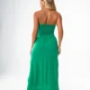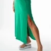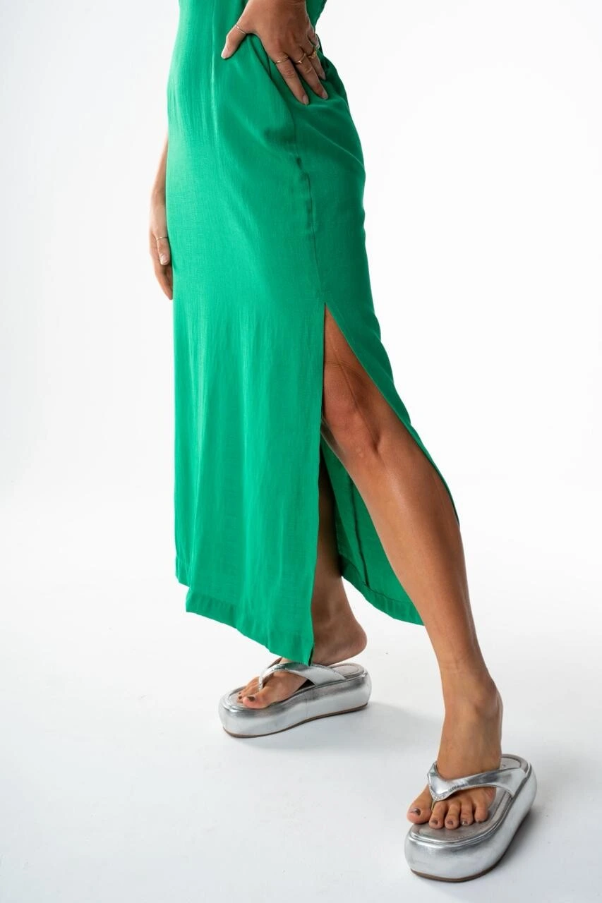 A modelagem justa no busto com saia fluida e fendas laterais garante conforto e movimento, enquanto o zíper invisível na lateral traz praticidade ao vestir.