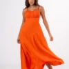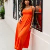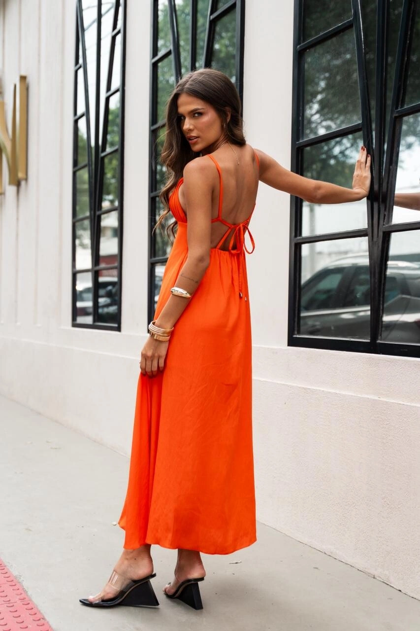 Confeccionado no Kalix, o modelo proporciona movimento e caimento impecável, acompanhando o corpo com graciosidade. A cor vibrante adiciona personalidade e presença, tornando uma peça marcante para ocasiões que pedem elegância e estilo.